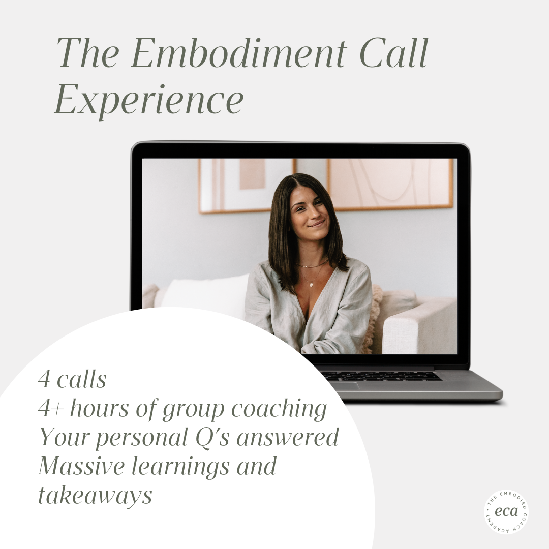 Inside of the Embodiment Call Experience, I will provide you with the answers to your most burning questions about all things Embodiment, Leadership, Mindset, Marketing, Confidence, β¦ so that you become the embodied, successful leader, Coach and CEO that you're destined to be. Get access to 4 live-led group calls with me + and the Embodied Coach Academy Community and get all the support you need to get to the next level. As a bonus, you get access to the recordings of all previous embodiment calls as well.